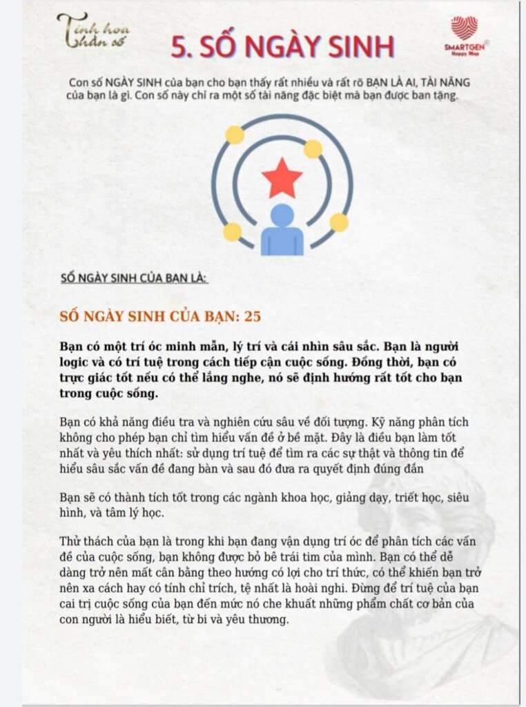 Từ sự liên quan này sẽ dẫn đến sự liên quan khác, khi chúng ta có được tên và ngày sinh, chúng ta đã có thể tính toán các con số và cho ra những kết quả về đặc điểm tính cách, khao khát riêng, sức mạnh và số phận của mỗi người. Những người tin vào Thần Số Học cho rằng những con số là phương thức rõ ràng nhất xác định ta là ai ngay từ khi sinh ra, những bài học ta cần phải trải qua và thử thách ta cần phải đối mặt. Có thể nói Thần Số Học chính là tấm gương phản chiếu hành trình của một con người dưới dạng con số.